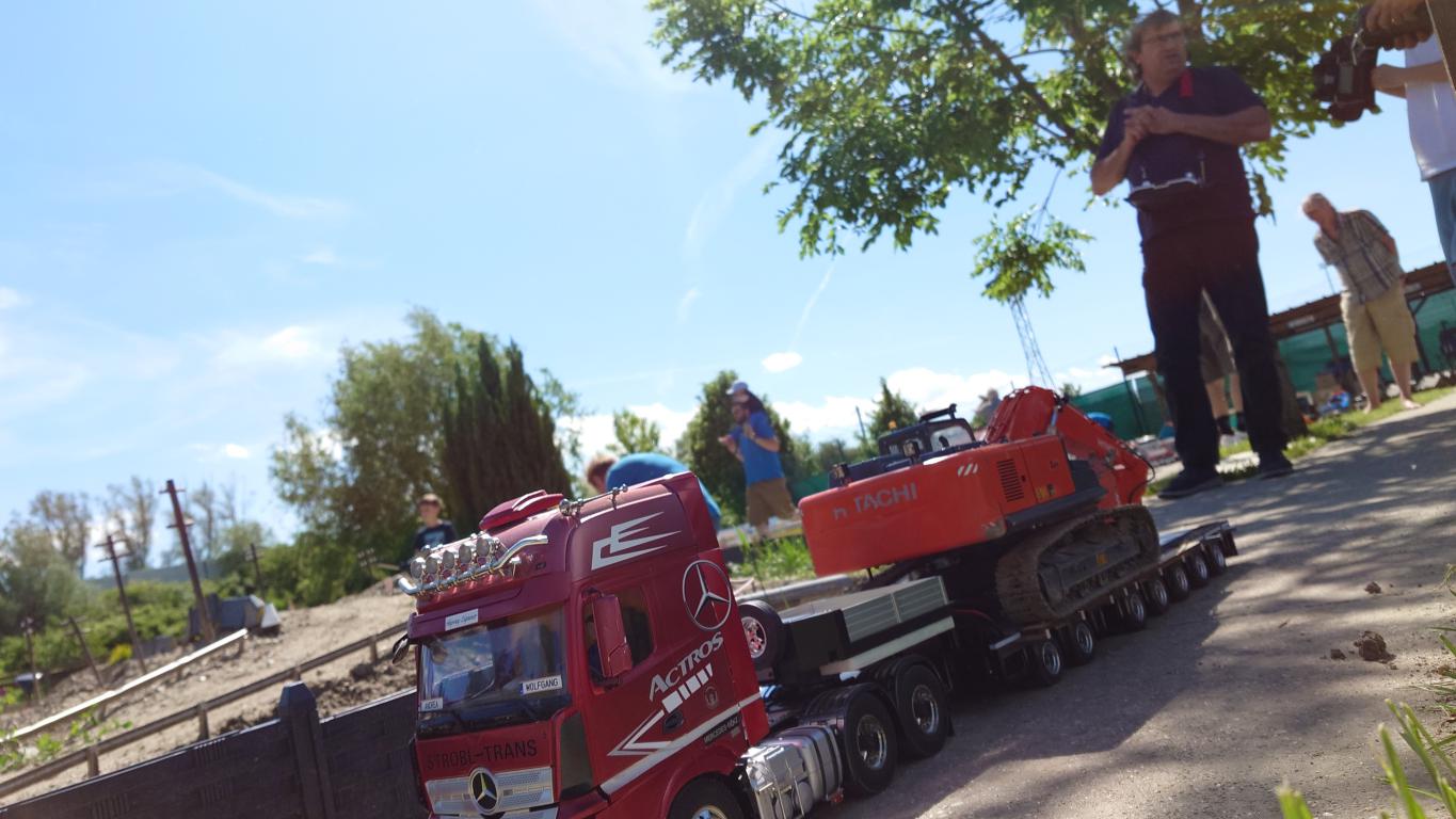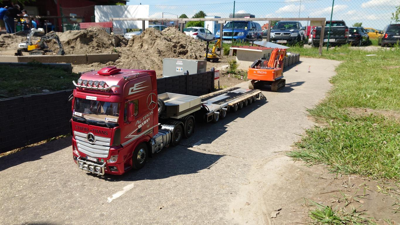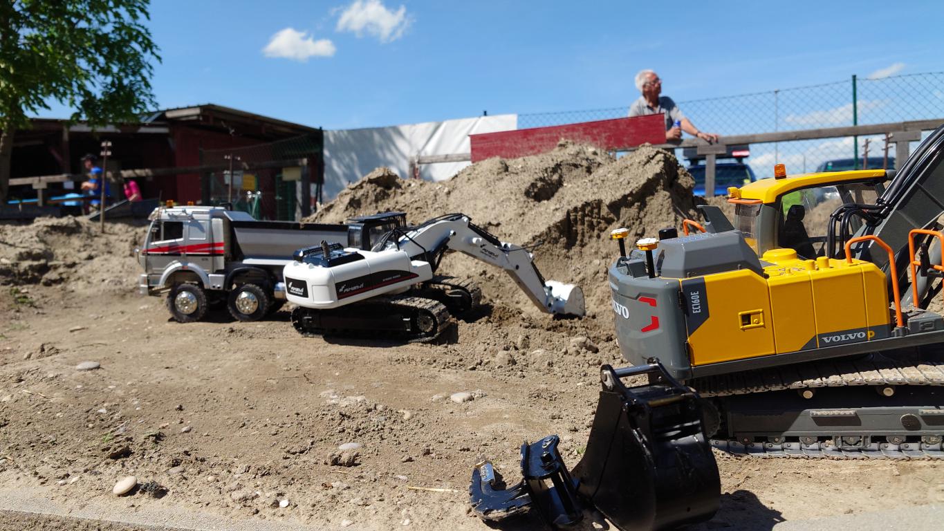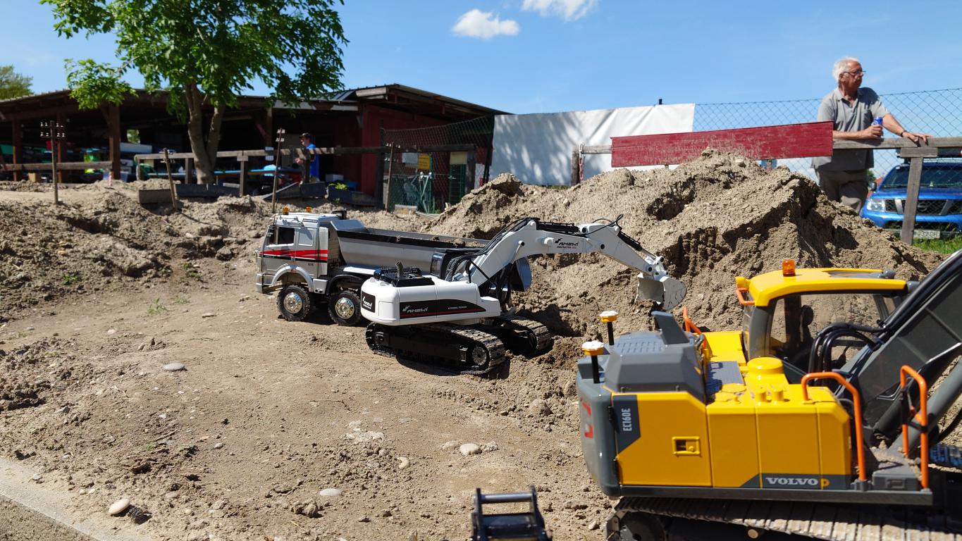 Nach einem unheimlich heftigen Gewitter mit Regengüssen in der Nacht auf Samstag war uns allen Bange, ob wenigstens der Samstags-Wetterbericht stimmen würde. Die Shortcourse-Rennbewerbe mussten zwar wegen der Unbefahrbarkeit der Strecke ausfallen, doch wir Erdbeweger hatten dafür "Kirtag". Schon die Morgensonne liess die Erde handfeucht bis trocken werden, ideal weich und trotzdem nicht klebrig. Sonnig, leichter Wind, tolle Stimmung und sehr viele Besucher, überwiegend Vereinskollegen. Von der Modellbau-Prominenz konnten wir u.a. Rene Gatti begrüßen, bekannt durch seine Eigenbauten, beispielsweise den ZIS 150 (Bericht "Altes Eisen", siehe hier)