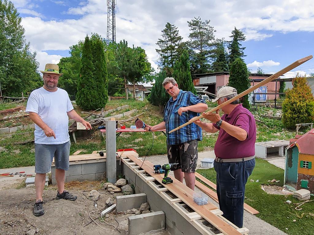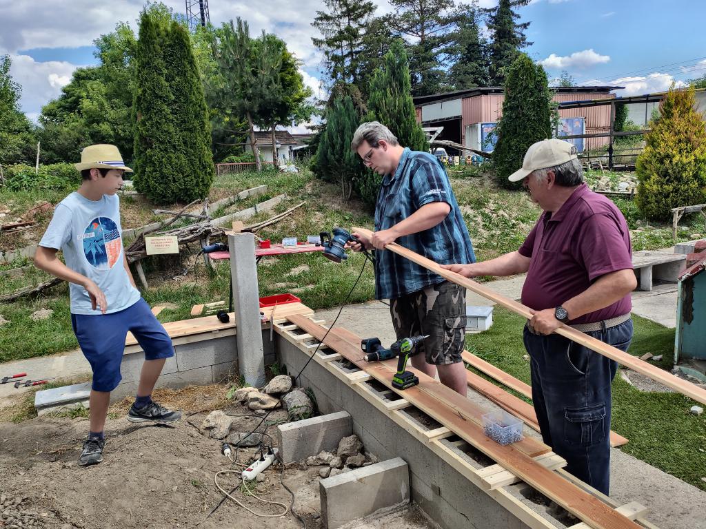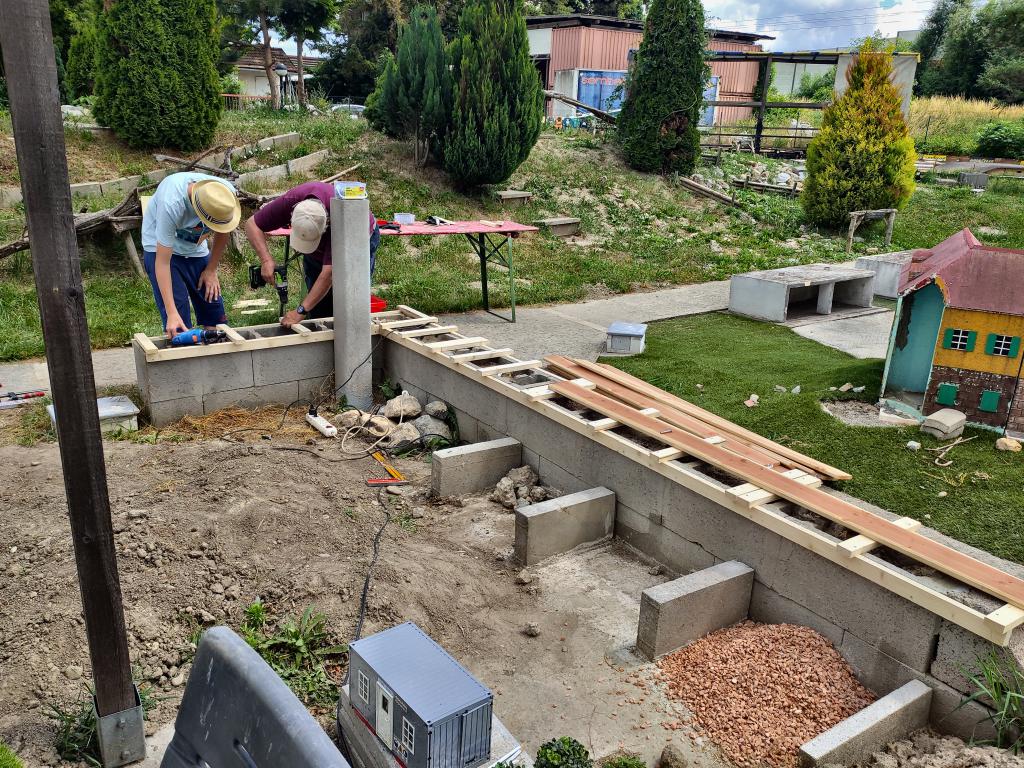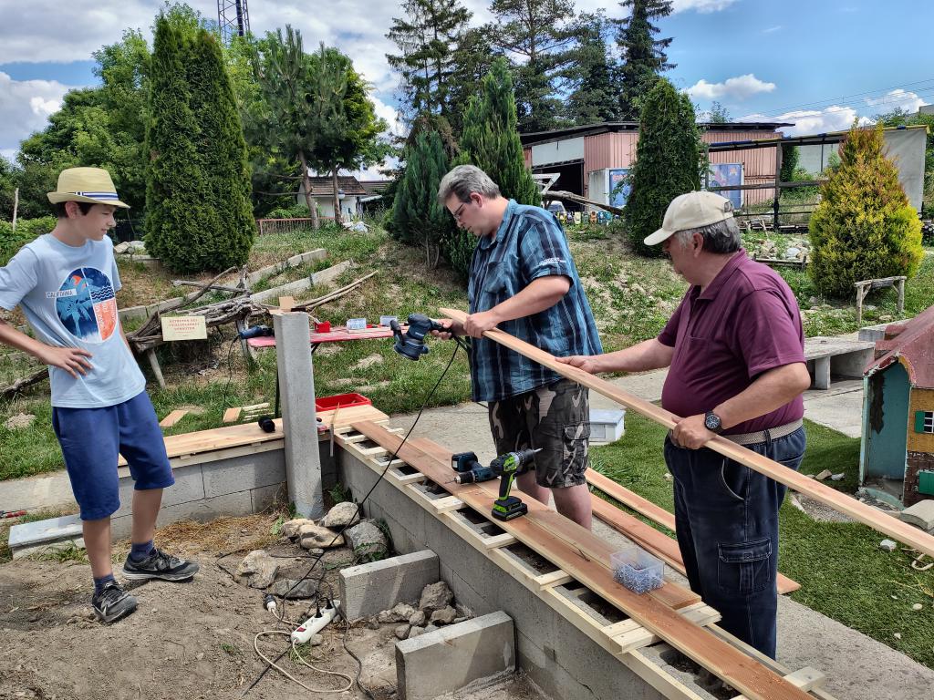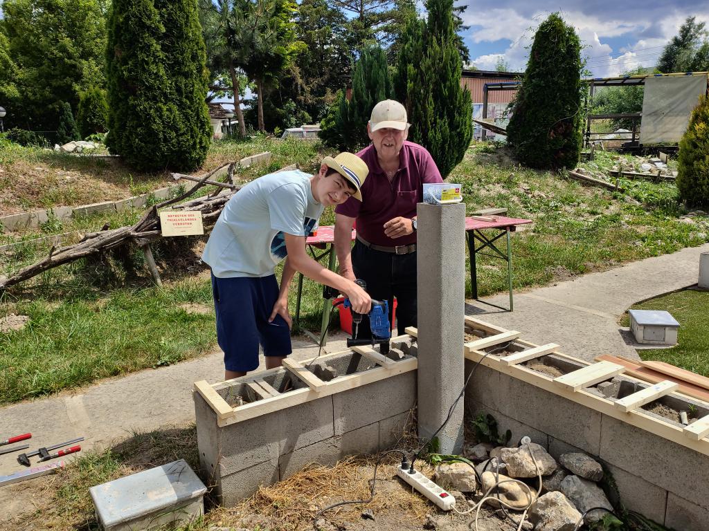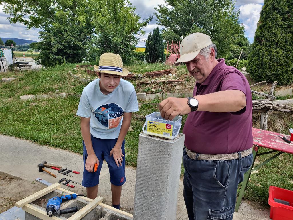 Im Zuge der Errichtung störte Willi die alte Schalsteinmauer, die irgendwann einmal eine Sitzbank gewesen sein soll. Anstatt Beton sind die Steine mit Erde befüllt und die alten Bretter waren teilweise längst weg oder, was noch da war, war verworfen und morsch. Bei dem Thema entwickelten wir spontan Teamgeist und an einem sonnigen Nachmittag im Juni 2021 entstand aus dem alten Schandfleck eine wirklich hübsche neue Sitzbank.